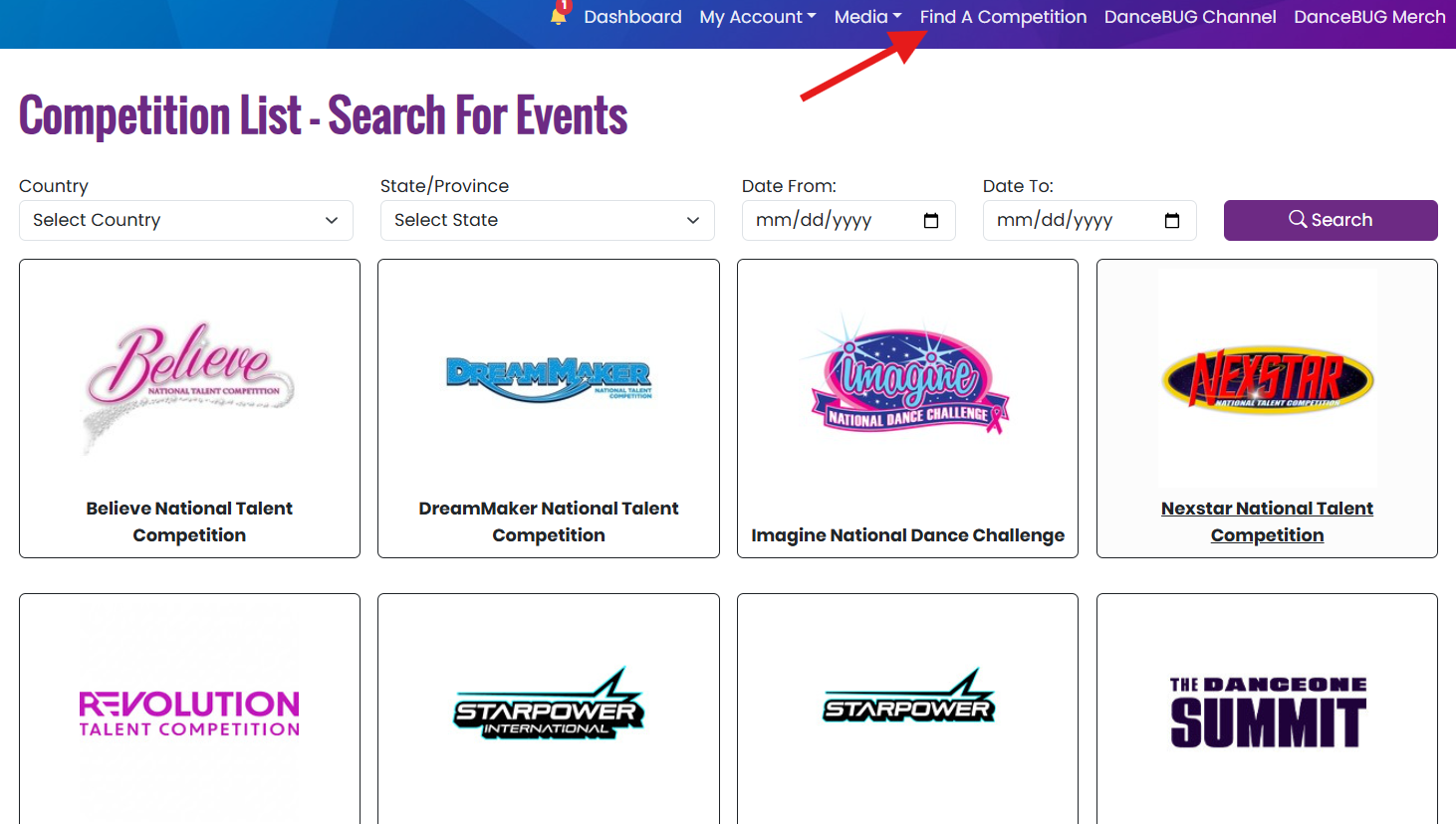 In the top-right corner, click on Find A Competition to bring you to the Competition List - Search For Events