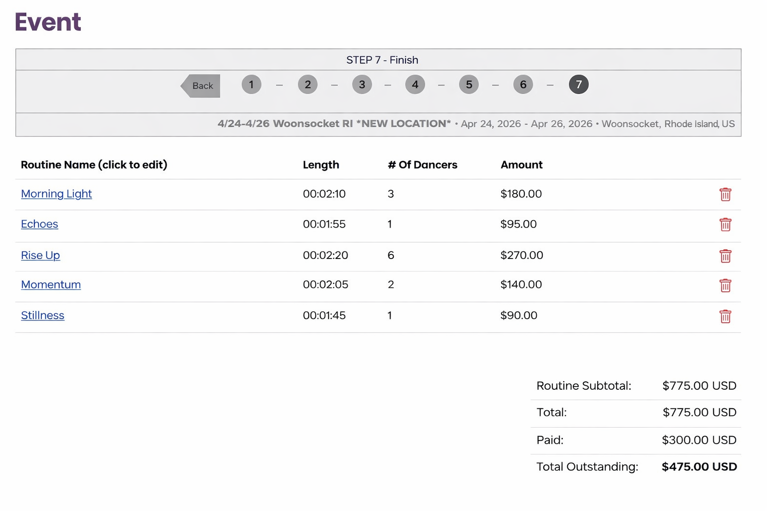 Click on the red trashcan icon beside the routine to remove a routine from this registration.