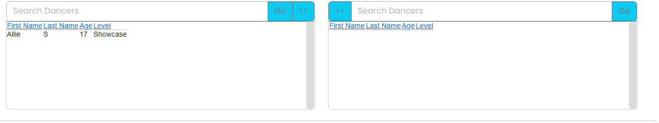 The left box lists all dancers in your active Dancer Roster, the right box lists dancers added to the routine.